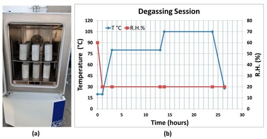 The Sunrise SU340 Climatic Chamber (Angelantoni, Massa Martana, Italy) was used for the degassing phase (Figure 8a). In Figure 8b, the evolutions of the temperature and the relative humidity set in the climate chamber for the degassing session are reported. Afterwards, visual analysis was carried out to detect eventual damage, and a picture was taken of the specimens, which were then wrapped in a waterproofing film. Six specimens were set aside (AXi, AYi, BXi, BYi, CXi, CYi, with i = 04, 05, 06), while the others were subjected to the higher-temperature treatments in the furnace.