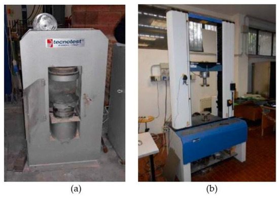 The compression strength tests were carried out following the EN 12390-3 standard [78], using a KE series compression machine (Tecnotest, Bergamo, Italy) with a 2000 kN maximum load (Figure 9a). Compressive strength is given by the following equation: