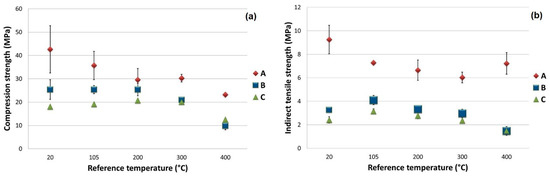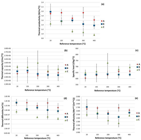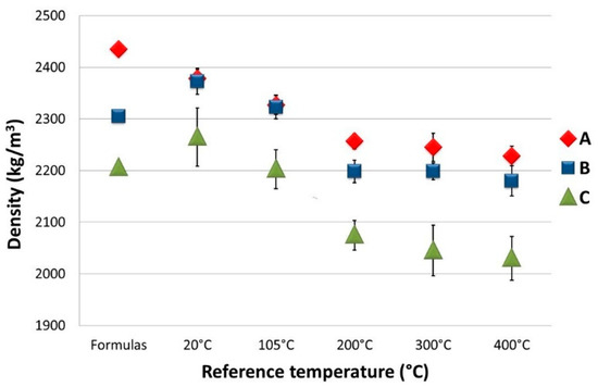 The density of the various mix designs was calculated as a weight-to-volume ratio, the latter being estimated as the average value of the three heights and three diameters measured for each concrete specimen. Table 5 shows the average densities for the specimens that were hardened (at 20 °C), degassed (at 105 °C) and heat-conditioned at 200, 300 and 400 °C, respectively. These densities are also compared with the initial ones derived from the formulas of the three mix designs. In Figure 10, the density values and their standard deviation are plotted as a function of the reference temperature.
