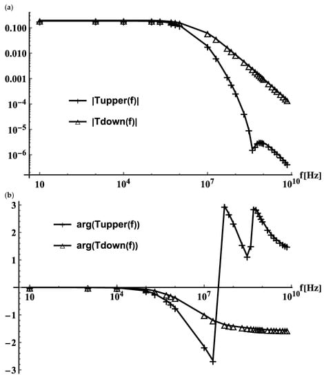 - The upper and lower resistor lengths are very short compared with the wavelength at f ≈ 300 MHz. Therefore, the distributed character of both resistors shall be taken into account for f > c/(20 L εr−1/2) ≈ 64 GHz, where c is the speed of the light in the vacuum, and the relative electric permittivity of SiO2 is equal to εr ≈ 3.9. Consequently, only a de-embedded procedure for a PCB is required for the PCB transmission lines’ elimination [2].