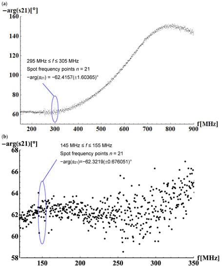 - As can be noticed, the application of the network analyser allows for the direct measurement of the power wave transmitted through the MEMS test structure s12 = s21, which represents the insertion loss of the analysed network. To determine the temperature time-lag delay, we used the s21 measurements for a frequency close to f = 150 MHz (n = 21 spot frequency points in the range 145 MHz ≤ f ≤ 155 MHz) and determined the averaged value and standard deviation of this parameter arg(s21) = 62.3219 (±0.676051)° at f = 150 MHz, with the sum of error squares (SS) = 9.01973 and degrees of freedom (DOFs) = 21 (see Figure 5). Finally, the temperature time-lag delay can be calculated from Equation (8):
