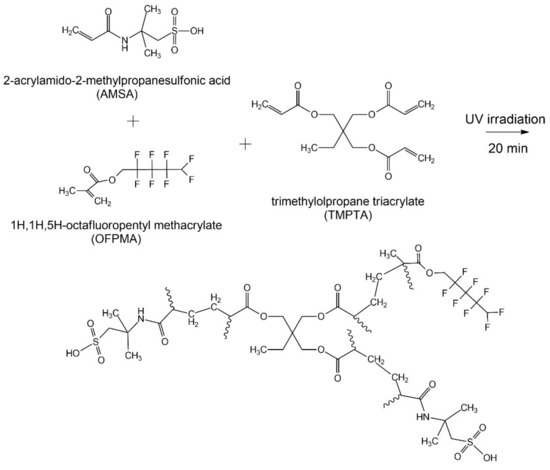 2-Acrylamido-2-methylpropanesulfonic acid (AMSA) as a monomer containing a cation exchange group, 1H,1H,5H-octafluoropentyl methacrylate (OFPMA) as a fluorinated monomer, and diphenyl(2,4,6-trimethylbenzoly)-phosphine oxide (TPO) as a photo-initiator were chosen and purchased from Tokyo chemical industry Co., Ltd. (Tokyo, Japan). In addition, trimethylolpropane triacrylate (TMPTA) as a tri-functional crosslinking agent and N,N-dimethylformamide (DMF) as a solvent were selected and purchased from Sigma-Aldrich Co. (St. Louis, MO, USA). All reagents used were used as received without further purification. We also chose Nafion 212 (DuPont, Wilmington, DE, USA) as the reference membrane to compare with the PFPEMs fabricated in this work.
