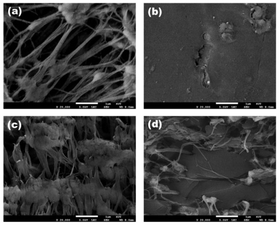 FE-SEM images of porous substrate and pore-filled membrane: surface—((a) PTFE porous substrate; (b) pore-filled membrane) and cross-section—((c) PTFE porous substrate; (d) pore-filled membrane).