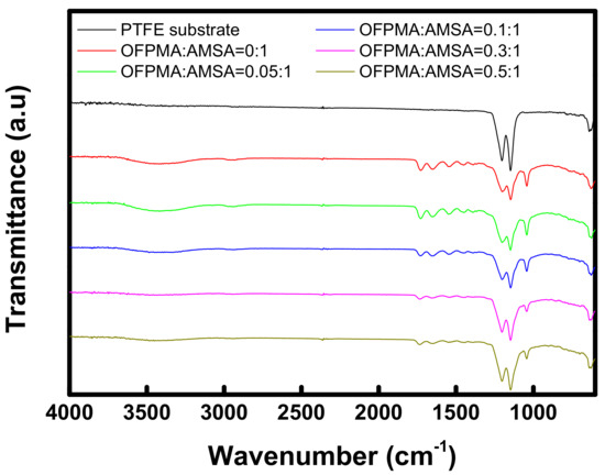 Figure 3 shows the FT-IR spectra of the PTFE porous substrates and prepared pore-filled membranes. The two characteristic absorptions assigned to –CF2 groups were found at 1203 and 1145 cm−1 in the spectra [25]. The absorption peak corresponding to the symmetric stretching (S=O) of sulfonate groups was also observed at 1045 cm−1 [26]. As the OFPMA/AMSA mole ratio is increased, it can be seen that the peak intensity of the –CF2 groups increases and that of the –SO3− groups decreases, simultaneously. Therefore, it can be confirmed that the partially fluorinated ionomer filled into the porous substrate was successfully synthesized according to the planned composition.
