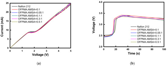 Figure 4 shows I–V curves and chronopotentiometry curves showing the electrochemical properties of the commercial membrane and PFPEMs. Both the I–V and chronopotentiometry curves exhibit typical polarization characteristics, so it can be concluded that all the tested membranes act as excellent ion selective barriers [24]. In addition, the difference among the samples in terms of the concentration polarization of membrane was shown to be within a normal experimental error range (<±5%) and no clear trend was found from the electrochemical responses displayed in Figure 4.