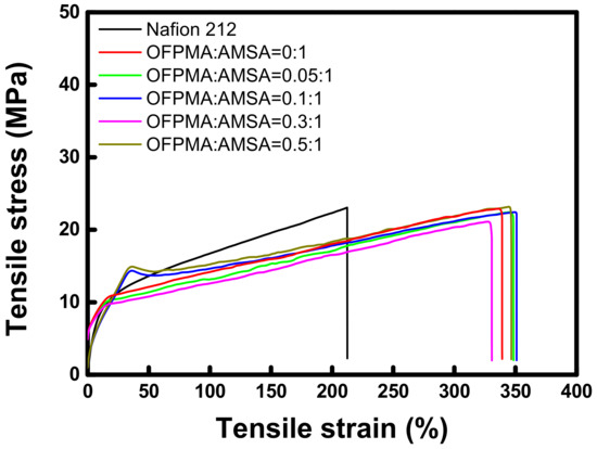 Figure 5 displays the tensile test results of the commercial membranes and prepared PFPEMs. It can be seen that despite the thinner thickness of the prepared PFPEMs compared to Nafion, they exhibit significantly greater toughness. In addition, it can be seen that the physical strength of the pore-filled membranes is not affected by the composition of the filling ionomer, because it is greatly influenced by the porous substrate used for the membrane fabrication.