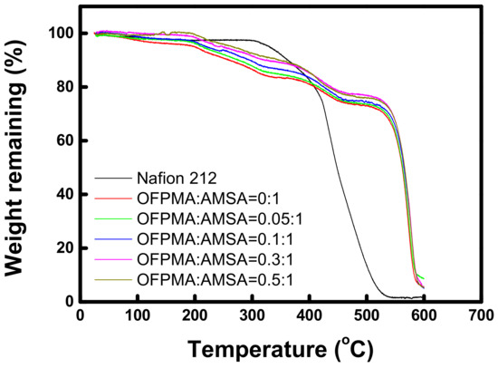 As revealed in Figure 6, the thermal stability of the commercial and prepared PFPEMs was evaluated as a function of the temperature, which was in the range of 25–600 °C. As a result, all the membranes were shown to be thermally stable up to 200 °C. Although there is a difference for each sample, the decrease in weight below 200 °C is considered to be due to the loss of –SO3H groups and water molecules adsorbed to the membrane [26]. However, no significant trend in weight loss was found among the membranes at 200 °C or lower. Above 200 °C, the PFPEMs started the decomposition of organic groups, which is faster than Nafion, but above 400 °C they showed superior thermal stability compared to that of Nafion. This is believed to be a result of the excellent thermal stability of the PTFE material used as the substrate.