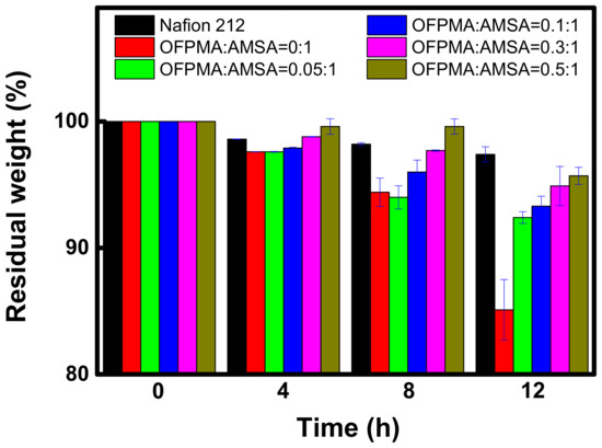 Time-course change in the residual weight of the commercial and prepared PFPEMs during the Fenton oxidation test (at 80 °C) is displayed in Figure 7. As a result, it was confirmed that the oxidation stability of the membrane was improved as the fluorine content was increased. That is, the OFPMA:AMSA = 0.5:1, which has the highest content of fluorinated monomer among the fabricated PFPEMs, showed the best oxidation stability, close to that of Nafion, a perfluorinated polymer. A fuel cell performance test was also carried out with the composition OFPMA:AMSA = 0.5:1, which has rather low proton conductivity but the best oxidation stability.