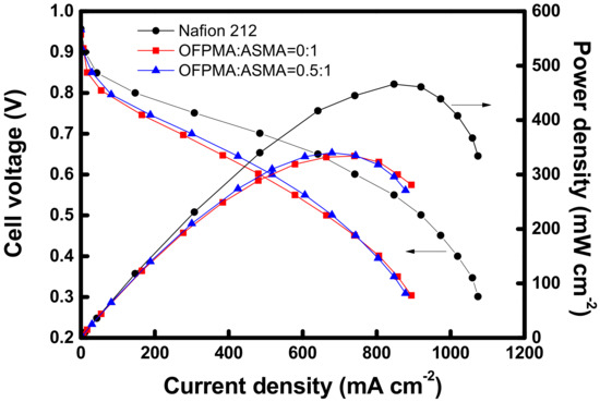 Figure 8 shows the results of the performance evaluation of the MEAs employing the Nafion 212 and PFPEMs, respectively. The fuel cell performance of the Nafion 212-based MEA shows the maximum power density, 466 mW cm−2 (at 847 mA cm−2), and the PFPEM-based MEAs also exhibit excellent performances; 334 mW cm−2 (at 740 mA cm−2) for OFPMA:ASMA = 0:1 and 340 mW cm−2 (at 679 mA cm−2) for OFPMA:ASMA = 0.5:1. This result is interesting since the prepared PFPEM-based PEMFC performance (as maximum power density) shows 72% of Nafion 212 even though the conductivity of the PFPEMs corresponds to 58–63% of that of Nafion 212. However, the current density of the PFPEMs is still significantly lower than that of the Nafion membrane. This means that the proton conductivity of the PFPEMs needs to be further improved, and it is expected that this can be achieved by increasing the IEC and optimizing the pore structure and porosity of the substrate.