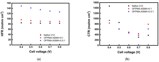 Figure 9 shows the results of the electrochemical impedance spectroscopy (EIS) analyses of the MEAs employing the commercial membrane and prepared PFPEMs, respectively. Figure 9a reveals the HFR order of Nafion < OFPMA:ASMA = 0:1 < OFPMA:ASMA = 0.5:1. That is, the HFR has a correlation with the resistance of the electrolyte membrane, and the result was opposite to the order of the proton conductivity of the membranes. However, in the case of the CTR shown in Figure 9b, the OFPMA:ASMA = 0.5:1 exhibits the lowest resistance among the tested membranes at the reference potential of 0.6 V. That is, in case of the OFPMA:ASMA = 0.5:1, the membrane resistance was rather high, but by introducing a fluorine moiety into the membrane, the affinity with the perfluorinated ionomer utilized as an electrode binder could be increased. As a result, it is thought that the reduced membrane-electrode interfacial resistance resulted in the enhancement of the fuel cell performance.