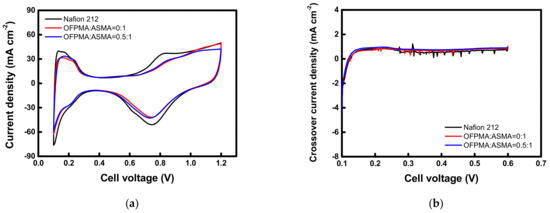 Figure 10a shows the cyclic voltammetry curve of the MEAs employing the commercial membrane and prepared PFPEMs. From these cyclic voltammetry curves, the electrochemically active surface area of the electrode can be estimated. The Nafion 212 shows the highest charge density (42.98 mC cm−2) and ECSA (102.3 m2pt/gpt), and the OFPMA:ASMA = 0:1 (32.30 mC cm−2; 76.90 m2pt/gpt), and OFPMA:ASMA = 0.5:1 (32.29 mC cm−2; 76.88 m2pt/gpt) revealed ca. 70% of the charge density and ECSA values, which corresponds to the result of the MEA performance. In addition, Figure 10b shows the measured hydrogen crossover current of the MEAs employing commercial membrane and prepared PFPEMs. As a result, the hydrogen crossover current density was maintained at less than 1.0 mA cm−2 for all the tested membranes, and thus it can be confirmed that there are no pores or defects in the prepared PFPEMs.