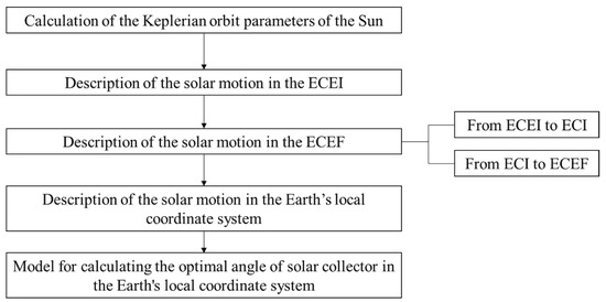 In summary, none of the existing studies have explored the orientation of a place on Earth toward the Sun from the perspective of Keplerian orbits. In addition, global analysis of the optimal tilt angle has not been reported. To provide guidance for fixed installation angles of solar collectors around the world, a refined theoretical model is proposed. This model mainly considers the Kepler motion of the Sun [22,24,25,26]. This motion can be transformed and then described by the local coordinate system. When the latitude, longitude, and geodetic height are known, the theoretical optimal angle of solar energy can be modeled according to this theory.