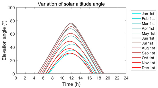 The vernal equinox is used as a representative of the whole year, using 50.5° N as an example. The altitude angle of the Sun calculated by the model is 38.8°. Therefore, the tilt angle of the solar collector is 51.2°, which is 0.8° greater than the ‘latitude definition’ method [10] of 50.5°. This shows how the model differs from the conventional method. When the levelized cost of electricity model [10] is taken into account, an integrated optimal inclination angle should also be slightly larger than it is in the conventional method.