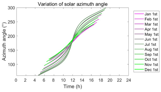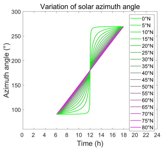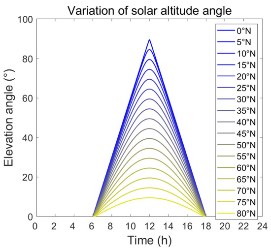 Figure 10 visualizes the potential losses that could result from deviating from the optimal solar placement angle. The vertical axis represents the solar energy accumulation calculated according to Equation (30). During the day, the difference in the tilt angle setting of the solar collectors causes a change in this accumulation. On the day shown, the optimal solar tilt angle for areas above 60° N is 15° or less. The higher the solar tilt angle at high latitudes, the more severe the solar loss. If the tilt angle is too high (e.g., 70°), it will result in only half the optimal angle of direct solar energy accumulation for that day. Similarly, at low latitudes, a high solar tilt angle, meaning that the solar collectors are nearly vertical to the ground, will also result in a reduction in direct solar accumulation. In addition, this figure shows that, with both sets to the local optimum inclination, lower latitudes receive higher solar energy accumulation than higher latitudes, although not significantly.