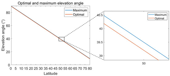 On the 2019 vernal equinox, the maximum and optimum tilt angles of the Sun on that day decrease with increasing latitude. Both are linearly decreasing in relation to latitude. This can be seen in Figure 9. In addition, the optimal tilt angle is not exactly equal to latitude but is about 0.9° smaller than latitude. Before the vernal equinox, the optimal tilt angle is smaller than latitude; around the vernal equinox, it is close to latitude; after the vernal equinox, it is greater than latitude.