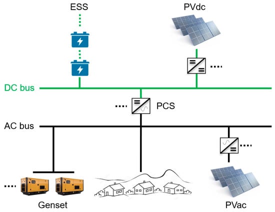 This paper focuses on microgrids that have no ability to connect to the grid and are therefore referred to as autonomous microgrids, also known as mini-grids in the context of rural energy access [6,7,8]. These systems have been used for a long time as a solution to bring access to electricity to remote locations where grid extension is unaffordable. The cut in renewable energy prices has introduced new types of autonomous microgrids, based on renewable energy resources and energy storage. The power ratings of these systems can range from as little as 50 kVA to a few MVA. Only PV systems and diesel generators (Gensets) are considered as the potential sources of generation. PV arrays can be either DC coupled (PVdc), AC coupled (PVac), or integrated into a hybrid architecture where one part of the solar system is connected to a DC bus and another part is connected to an AC bus. Figure 1 shows the microgrid architecture that is considered for the paper. Energy storage systems (ESSs) are used to store excess renewable energy, allowing for a further decrease in the use of fossil-based generation and can be in the form of electrochemical, kinetic, compressed air, or gravitational; however, only battery storage is considered in this paper. A power conversion system (PCS) is required to interface the DC sources (ESS and PVdc) to the AC bus.
