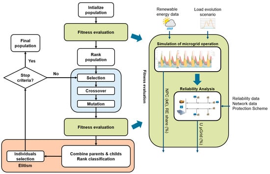 A genetic algorithm was selected for its ability to implement various control algorithms and component models without the need to adapt the optimization formulation. A schematic of the global method developed is presented in Figure 2. This method is presented in [42]. In the evaluation of each microgrid configuration, the simulation gives indicators for the objectives of cost and renewable energy integration and the reliability analysis gives the indicator of unavailability. Both evaluations are performed in a python environment [43]. The planning horizon is 15 years.
