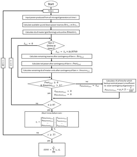 Each component is modeled with a short-term failure rate corresponding to the failure probability of component n at time step t. Failure rates are assumed constant throughout the component life. A blackout state is obtained when there is not enough reserve power to counteract the contingency or when no backup master unit is available to take over the role of grid-forming. For each of the considered failures, the steps illustrated in Figure 3 are followed.