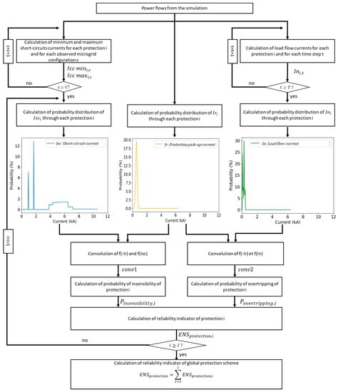 The different steps toward the protection reliability assessment method are described in Figure 4. The microgrid is modeled with the package Pandapower [47] in the Python environment, which is used for static network analysis. All buses, lines, converters, and loads are modeled. The first step consists of calculating short-circuit currents on each microgrid configuration observed from the simulation. These configurations correspond to all possible on/off combinations of the different short-circuit current contributors, including gensets, PCS inverters, and PVac inverters. Next, load flow simulations are made for each simulation time-step to calculate the current flowing through each protection. Reliability indicators are then calculated to assess the protection scheme. Three probability distributions must be obtained to calculate these reliability indicators:
