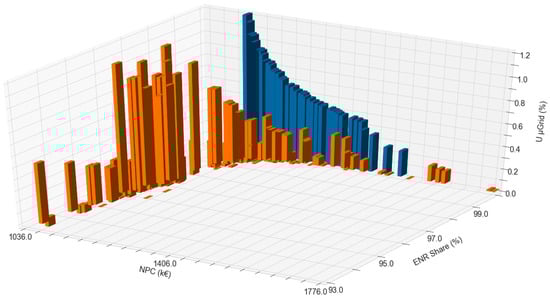 The multi-objectives optimization method presented in Section 3 was applied to the case study. The NSGA-II has led to the 3D Pareto surface shown in Figure 7. There is a strong relationship between all three objectives. To increase the renewable energy integration, an increase in net present cost is required. Configurations without gensets (in blue) lead to an increased unavailability and increased net present cost compared to configurations with gensets (in orange). Configurations with renewable energy integration less than 93% are not included in the Pareto frontier. They are thus not leading to an improvement in either net present cost or reliability. Considering the control strategy, only load following dispatch was found in the Pareto surface, which proves this type of control more interesting for this level of renewable integration.