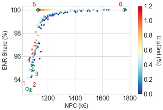 Figure 8 shows the same Pareto points in a 2D graph with the third objective of reliability shown in a color scale. It can be observed that reliability can be improved with a small increase in net present cost for a similar renewable energy integration. In this figure, six configurations of interest have been selected for more detailed analysis: