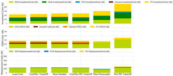 The least-cost configuration (config 1) can be obtained at a net present cost of 1.050 M€ over the 15-year period considered. An improvement in reliability (config 2) can be obtained for a net present cost of 1.074 M€. A solution with 0% unavailability (config 3) can be obtained at a cost of 1.089 M€. A compromise between all three objectives (config 4) can be found for a net present cost of 1.091 M€, having a renewable energy integration above 95% and an unavailability under 0.1%. A 100% renewable energy solution can be obtained for a net present cost of 1.130 M€ but with high unavailability of 1.2% (config 5). Reaching a high level of reliability with 100% renewable energy integration (config 6) would require oversizing considerably the components and, therefore, adds significant costs to the design (1.76 M€).