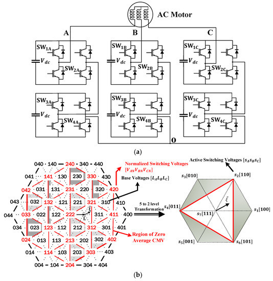 (a) Five-level CHB converter topology, (b) five-level space vector diagram and transformed two-level one.
