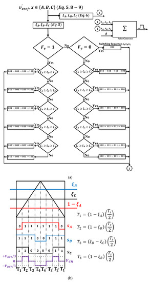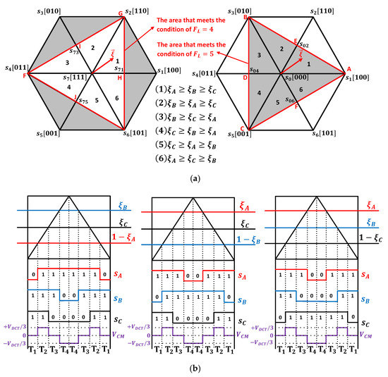 The zero average CMV in one sampling period results in in (21). Figure 1b shows that the red-line hexagon is the region where the average CMV is zero. This region consists of six sub-regions corresponding to two cases of and , as shown in Figure 3. The reference vector in the five-level space vector diagram can be synthesized by in the two-level one with the aid of the base voltage vector , as illustrated in Figure 1b. Under the condition of zero average CMV and reduced CMV magnitude, three possible switching sequences can be used to synthesize , as shown in Figure 3b, for and in the area (1). Among these, there is only one switching sequence that yields the best output harmonic distortion, i.e., 011 111 110 110 [33]. The dwell time calculation of which is also shown in Figure 4b, along with the flowchart featuring switching sequences for the areas (1)–(6) which also gives the minimum output harmonic distortion. In this article, they are referred to as RCMV1-PWM.