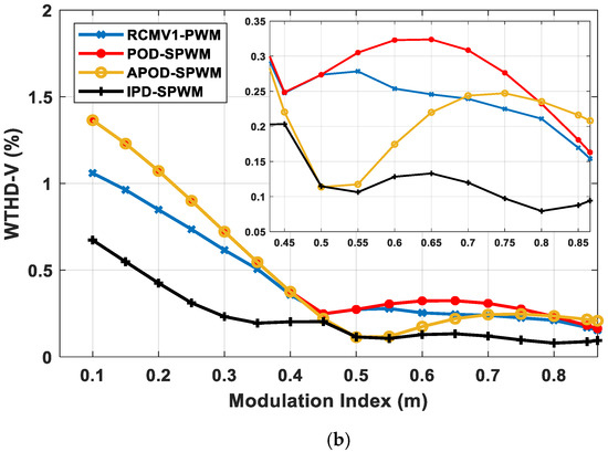 On the basis of the comparable power loss set forth in Section 4.2, the output harmonic distortion performance of RCMV1-PWM is compared against that of other methods. The THD and WTHD of voltage and the THD of current, as well as the RMS value of current ripple, are evaluated with regard to the modulation index for four strategies. Figure 5 and Figure 6 shows that the IPD-SPWM gives the best output quality for a whole modulation range due to the three nearest vectors principle. However, the magnitude of CMV is twice as high as that of other strategies, as illustrated in Figure 7a. Hence, it is unfavorable in motor-drive applications due to adverse effects of high CMV magnitude, as mentioned earlier. As demonstrated in Figure 5 and Figure 6, the proposed RCMV1-PWM produces better output harmonic performance than the POD-SPWM over a whole modulation range. For example, at m = 0.3, the THD values of voltage and current outputs are 61.78% and 22.19%, respectively, for RCMV1-PWM as opposed to 73.55% and 26.65%, respectively, for POD-SPWM. This translates to a more than 10% improvement of THD of voltage output and a more than 4% improvement of THD of current output. Likewise, at m = 0.3, the WTHD of voltage output, and the RMS value of phase current ripple, are 0.61% and 0.13 A, respectively, for RCMV1-PWM in comparison to 0.73% and 0.16 A, respectively, for POD-SPWM. Both RCMV1-PWM and POD-SPWM produce a reduced magnitude of CMV of for a whole modulation range, as shown in Figure 7a. As a result, under the reduced-CMV-magnitude condition, RCMV1-PWM is more favorable than POD-SPWM in motor-drive applications due to the lower output harmonic distortion. As for APOD-SPWM, its THD and WTHD of both voltage and current outputs, as well as RMS value of current ripple, are inferior to those of RCMV1-PWM for and . For these two modulation ranges, both APOD-SPWM and RCMV1-PWM obtain a reduced CMV magnitude of as demonstrated in Figure 7a. For , the output harmonic performance of APOD-SPWM is better than that of RCMV1-PWM. However, the CMV magnitude of APOD-SPWM in this modulation range is the same as that of IPD-SPWM, i.e., as shown in Figure 7a. Hence, the better output harmonic performance of APOD-SPWM is achieved at the expense of higher CMV magnitude. Therefore, under the reduced-CMV-magnitude condition, the proposed RCMV1-PWM gives the most optimum output harmonic performance.