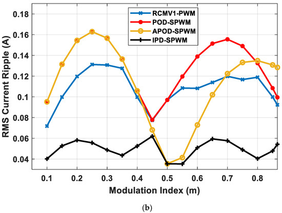 Comparative analysis of (a) THD and (b) RMS ripple of current ripple for different PWM strategies with respect to modulation index.