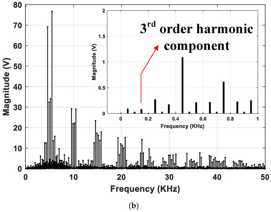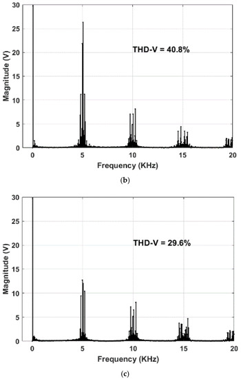 The frequency spectrum of CMV for RCMV1-PWM is also shown in Figure 7b. As can be observed from this figure, the third harmonic component of the CMV () is virtually nonexistent, which indicates the zero average CMV in one sampling period is maintained.
