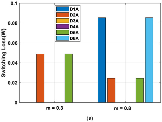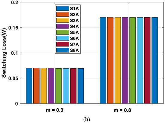 The conduction and switching loss of eight IGBTs of the phase leg A for RCMV1-PWM at m = 0.3 and m = 0.8 under the power factor of 0.99 in the five-level CHB inverter are shown in Figure 8. As shown in Figure 8, the equal power loss distribution among switching devices is achieved for the proposed strategy, as indicated in Section 2.