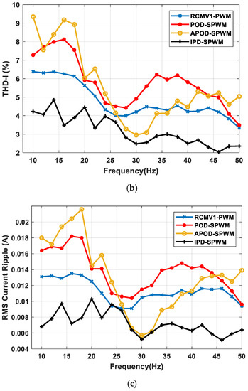 The harmonic distortion performance of each PWM strategy is evaluated by the THD of the voltage and current outputs, the weighted THD (WTHD) of the voltage output, and the root mean square (RMS) of current ripple in Ampere. The formulas of these performance metrics are given as follows [33]: