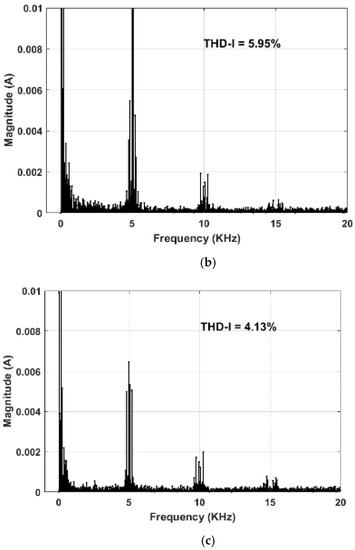 With regard to the current, the THD of current and the RMS values of current ripple of RCMV1-PWM are consistently better than those of POD-SPWM for a whole fundamental frequency range, as illustrated in Figure 12b,c, respectively. This is further supported by the frequency spectra of current of both RCMV1-PWM and POD-SPWM as shown in Figure 14a,b at f0 = 36 Hz. As can be observed from Figure 14a,b, the harmonic components around the switching frequency (f = 5 KHz) are significantly less than 6 mA in RCMV1-PWM, as opposed to more than 10 mA in POD-SPWM. Similar to the THD of voltage, the THD of current and the RMS values of current ripple of APOD-SPWM are lower than those of RCMV1-PWM for (), which corresponds to a higher CMV magnitude of APOD-SPWM. As for f0 < 26 Hz (m < 0.45) and f0 > 36 Hz (m > 0.62), the THD of current, as well as the RMS value of current ripple of APOD-SPWM are worse than those of RCMV1-PWM, as evidenced in Figure 12b,c. The harmonic distortion calculations, including THD and WTHD in both simulation and experiment, are calculated up to the 200th harmonic of the fundamental frequency.