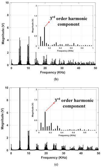 As for the CMV reduction performance, both RCMV1-PWM and POD-SPWM produce a reduced magnitude of CMV of for a whole fundamental frequency range. In particular, the CMV waveforms and their frequency spectra are shown in Figure 11a,b and Figure 15a,b, respectively, at f0 = 36 Hz (m = 0.623). The CMV reduction performance is demonstrated by the reduction in the magnitude of CMV components around the switching frequency (f = 5 KHz). Specifically, they are less than 5 V for both RCMV1-PWM and POD-SPWM compared to more than 10 V for APOD-SPWM at f0 = 36 Hz (m = 0.623), as shown in Figure 15. Moreover, the 3rd harmonic component of CMV, as shown in Figure 15, is well less than 1 V, which accounts for less than 2% of Vdc (Vdc = 50 V), thereby ensuring the zero average CMV in one sampling period for RCMV1-PWM. Therefore, under the condition of the reduced magnitude of CMV, the zero average CMV, and the equal distribution of power loss, the proposed strategy produces the most optimum output harmonic performance when compared to POD-SPWM, and APOD-SPWM.