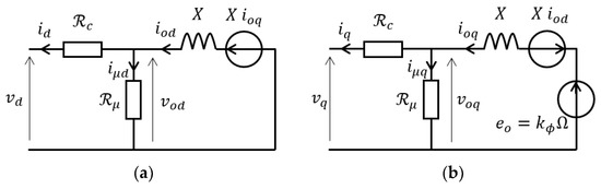 The presented methodology is based on the d–q axis equivalent circuit model taking iron losses into account via the iron loss resistance (see Figure 1) [13,14].