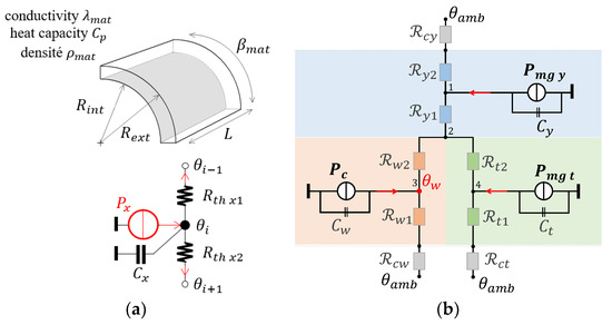 (a) Thermal equivalent circuit of a cylindrical element; (b) lumped parameter thermal model of PMSG.