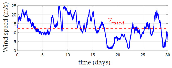 In this section, the methodology previously presented is applied to design a direct-drive PMSG for a 10 MW wind turbine (see specifications given in Table 1). A wind speed profile of 4500 points (one point every 10 min), measured in the North Sea during one month, will be considered (Figure 4) [26]. The case of a three-bladed pitch-regulated variable speed wind turbine is considered in this study. It operates at the maximum power point between a cut-in wind speed of 2.5 m/s and a rated wind speed of 12.4 m/s. Above this speed, the maximum power is limited and kept constant.