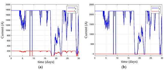 Figure 8 represents the profile of the currents and during the cycle for the lightest three-phase machine only. In the case of the FW current mode control, the current is adjusted at each working point to minimize the electrical power losses according to (12).