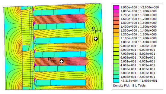 The maximum flux densities in the yoke and teeth must be limited at the saturation level, such as
