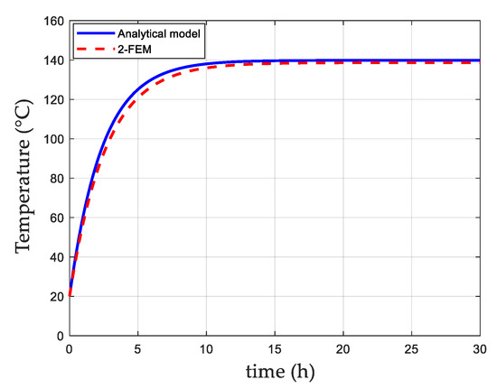 In order to validate the thermal model and its transient regime, the evolution of the temperature in the winding was calculated considering a step of power (see Figure 12) with copper and iron losses in the yoke and tooth (see Table 7) at full load, for . The result shows that both the transient and the final temperature in the winding are in good agreement.