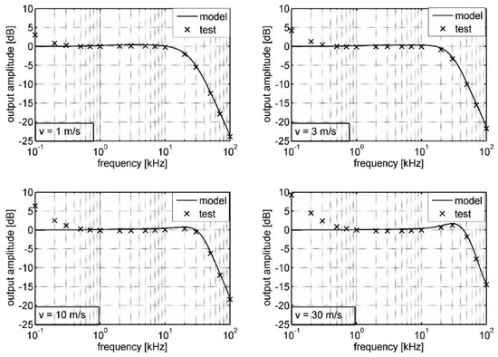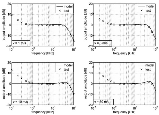Figure 3 show that for frequencies above 1 kHz, the course of the anemometer frequency response determined by the described method practically coincides with the modeling results. In the range of low frequencies, we assume the course of the frequency response to be flat. As the velocity increases, the bandwidth widens, and the gain for high frequencies increases as well. The performed sinusoidal test also provides information on the dynamic properties of the sensor. In this case, the value of the characteristic frequency at which the sensor’s thermal inertia significantly limits changes of its temperature from about 700 Hz for a velocity of 1 m/s to 2 kHz for a velocity of 30 m/s.