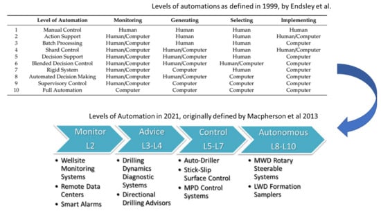 Automation in drilling equipment such as oil rigs has a strong impact on the exploration and development of hydrocarbons. Many oil companies are now starting to equip their drilling equipment such as oil rigs with autonomous drilling control systems to achieve improved performance times. According to PRNewswire [7], automation helps improve safety standards by reducing human intervention at drill sites and reducing labor costs whilst increasing the operational efficiency of hydrocarbon extraction and being applicable both offshore and onshore. A typical example is the launching of the first fully autonomous offshore platform capable of performing drilling operations with little or no operational staff by a European oil and gas company [8,9]. Another example is that of integrated drilling systems, such as Amphion and Cyber base, which increase drilling control over the rig equipment, enhance safety and efficiency, and reduce redundancy on rigs by providing control systems that automate drill floor processes and equipment interaction for both offshore and onshore activities [10]. IoT in offshore operations seems to have become an important “added value” concept for most operators [11]. Moreover, as of 2021, automation has been mostly transferred from offshore to onshore activities, particularly those activities with intensive and repetitive activities, such as those involved in shale and coal bed methane drilling. Figure 1 shows that a full automation level is defined as the level at which the computer solely takes care of the whole activity, namely monitoring and data analysis, generating the decisions, selecting the best option, and implementing the selected decision. Although Endsley et al. [12] published this concept about levels of automation two decades ago, Macpherson et al. [13] have adapted Endsley concept for drilling activities, proposing the same 10 levels of automation, whereas the autonomous level involves self-decisional systems such as rotary steerable systems. As of 2021, the new direction is trending towards autonomous drilling rigs that can perform drilling without direct human intervention. The levels of automation shown in Figure 1 are ranked from 1 to 10, where L10 will represent the autonomous drilling system. According to Macpherson et al. [13], the rotary steerable systems are ranked L8–L10, meaning that the need for human intervention is minimal, and only during monitoring/generating of the process. To date, a fully autonomous system, as per the definition provided by Endsley et al. [12], has not yet been realized, however, a few attempts have been already published [14]. Although not comparable, it is worth mentioning that the mining industry has reported fully autonomous blast hole drilling systems since 2018.