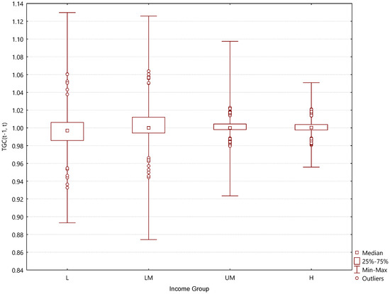 Table 2. In this analysis, 51 economies are in the high-income group (denoted as H), 42 are in the upper-middle-income group (denoted as UM), 31 are in the lower-middle-income group (denoted as LM), and 26 are in the low-income group (denoted as L).