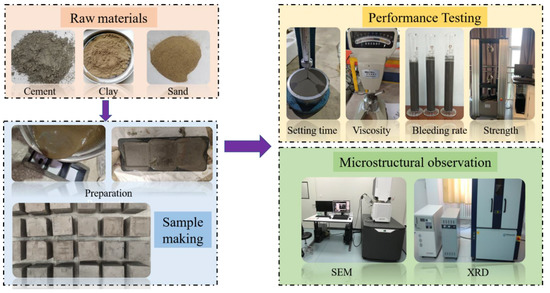 The prepared material was made into clay–cement slurry according to different proportions in the Box-Behnken design, and the basic properties of the slurry were tested. The bleeding rate is an important standard to measure the stability of grouting. The prepared grouting was poured into a 100-mL measuring cylinder and allowed to stand for two hours before measuring its bleeding rate. The viscosity of the slurry was measured by a rotary viscometer, according to the “Determination of kinematic viscosity and calculation of dynamic viscosity” [22]. The initial setting time and final setting time of the slurry were tested by a Vicat apparatus. The specimen was made according to the “Code for acceptance of construction Quality of concrete Structure Engineering” [23]. After storing the specimen for 1 day, we left the mold and put it into a box for curing. The compressive strength of the specimen with a specified curing time was tested. The cured material was microscopically analyzed using a scanning electron microscope (SEM) and X ray diffraction (XRD). The specific experimental steps are shown in Figure 1.