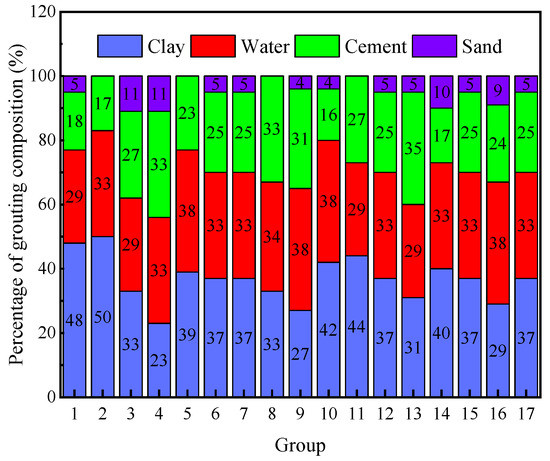 Many experts have added additives such as a solid setting, accelerator, and water-reducing agent in the process of studying slurry, but little research has been done on slurry composed of a cement base. Only after mastering the essential law of slurry without any additives can appropriate reagents be added to meet the engineering needs [17]. Therefore, the plasticity grouting materials were analyzed without any additives in this experiment.