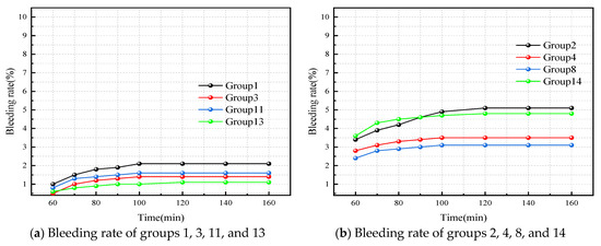 Bleeding rate of slurry with different components. (a) Bleeding rate of groups 1, 3, 11, and 13; (b) Bleeding rate of groups 2, 4, 8, and 14; (c) Bleeding rate of groups 5, 9, 10, and 16; (d) Bleeding rate of groups 6, 7, 12, 15, and 17.
