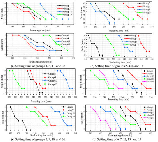 Setting time of the slurry with different components. (a) Setting time of groups 1, 3, 11, and 13; (b) Setting time of groups 2, 4, 8, and 14; (c) Setting time of groups 5, 9, 10, and 16; (d) Setting time of 6, 7, 12, 15, and 17.