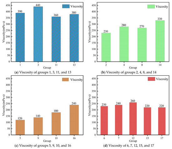Viscosity of the slurry with different components. (a) Viscosity of groups 1, 3, 11, and 13; (b) Viscosity of groups 2, 4, 8, and 14; (c) Viscosity of groups 5, 9, 10, and 16; (d) Viscosity of 6, 7, 12, 15, and 17.