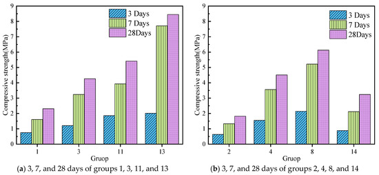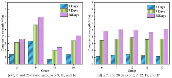 The strength of grout stones in different curing periods. (a) 3, 7, and 28 days of groups 1, 3, 11, and 13; (b) 3, 7, and 28 days of groups 2, 4, 8, and 14; (c) 3, 7, and 28 days of groups 5, 9, 10, and 16; (d) 3, 7, and 28 days of 6, 7, 12, 15, and 17.